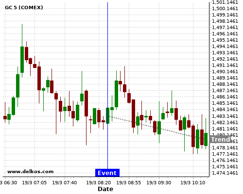 This probability is based on the last 12 CH SNB Interest Rate Decison events, in which 9 of the last 12 events where the actual number was equal to than the economist consensus resulted in an down trend of GC.