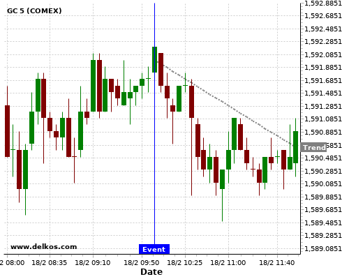 This probability is based on the last 12 DE ZEW Economic Sentiment Index events, in which 3 of the last 4 events where the actual number was less than than the economist consensus resulted in an down trend of GC.