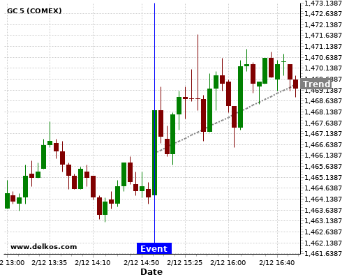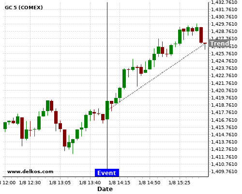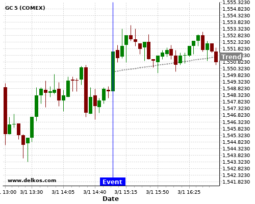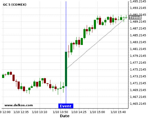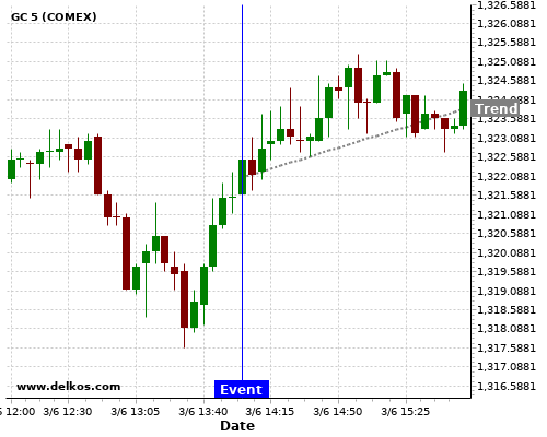 This probability is based on the last 12 US ISM Manufacturing PMI events, in which 6 of the last 8 events where the actual number was less than than the economist consensus resulted in an up trend of GC.