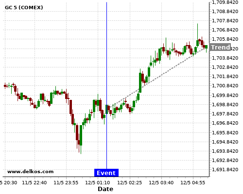 This probability is based on the last 12 AU NAB Business Confidence events, in which 1 of the last 4 events where the actual number was greater than than the economist consensus resulted in an up trend of GC.