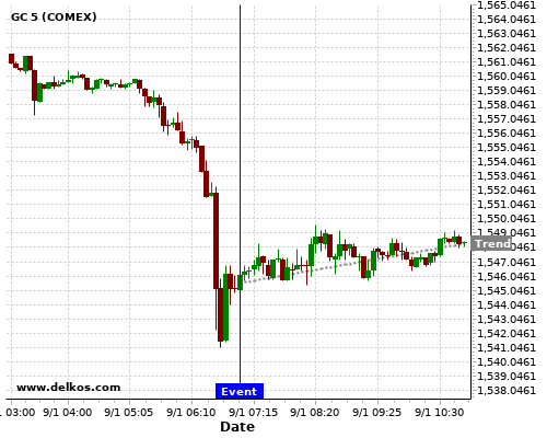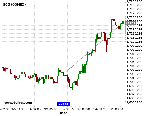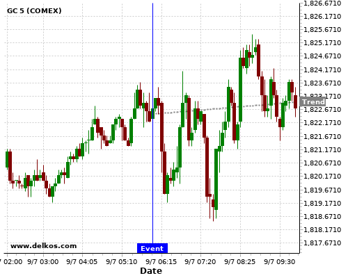 This probability is based on the last 12 DE Balance of Trade events, in which 3 of the last 4 events where the actual number was less than than the economist consensus resulted in an up trend of GC.