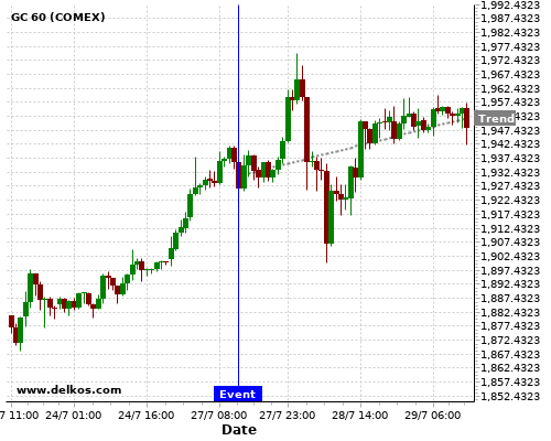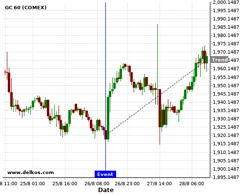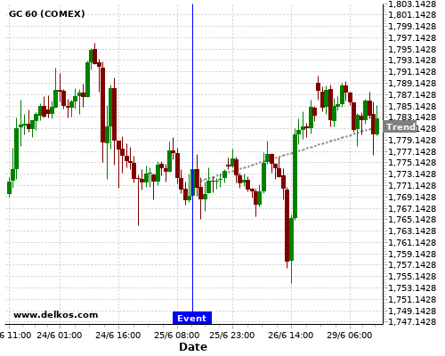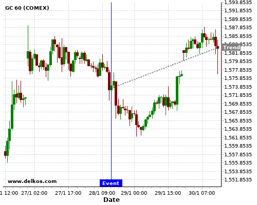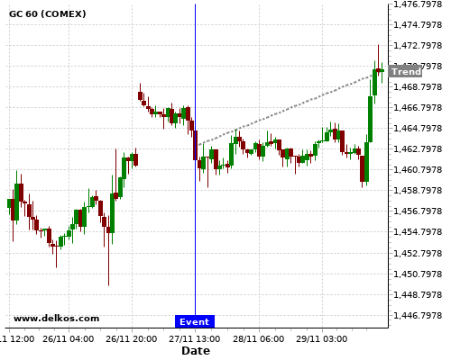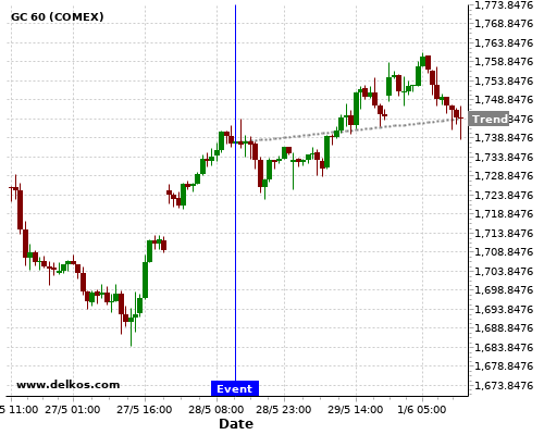 This probability is based on the last 12 US Durable Goods Orders MoM events, in which 6 of the last 8 events where the actual number was greater than than the economist consensus resulted in an up trend of GC.