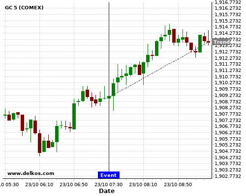 This probability is based on the last 12 DE Markit Manufacturing PMI Flash events, in which 6 of the last 9 events where the actual number was greater than than the economist consensus resulted in an up trend of GC.