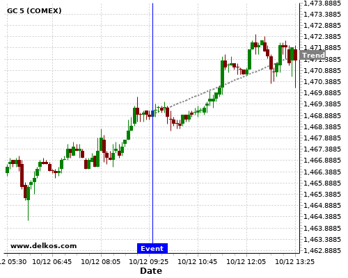 This probability is based on the last 12 GB Balance of Trade events, in which 3 of the last 4 events where the actual number was less than than the economist consensus resulted in an up trend of GC.