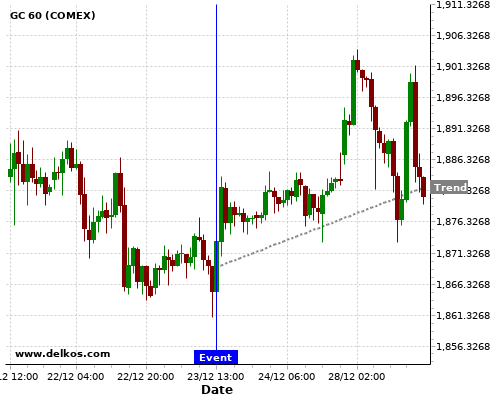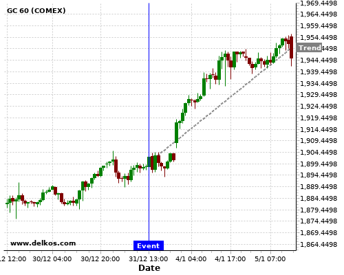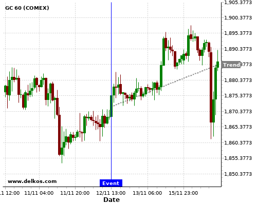 This probability is based on the last 12 US Continuing Jobless Claims events, in which 4 of the last 8 events where the actual number was less than than the economist consensus resulted in an up trend of GC.