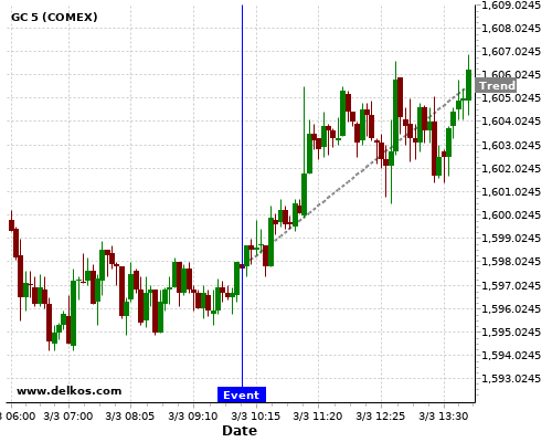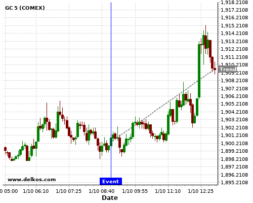 This probability is based on the last 12 EMU Unemployment Rate events, in which 3 of the last 4 events where the actual number was equal to than the economist consensus resulted in an up trend of GC.