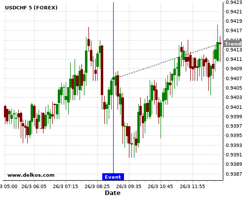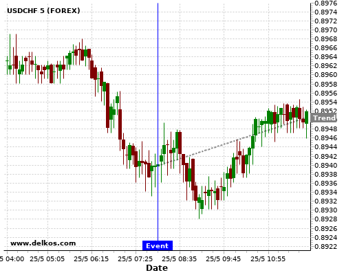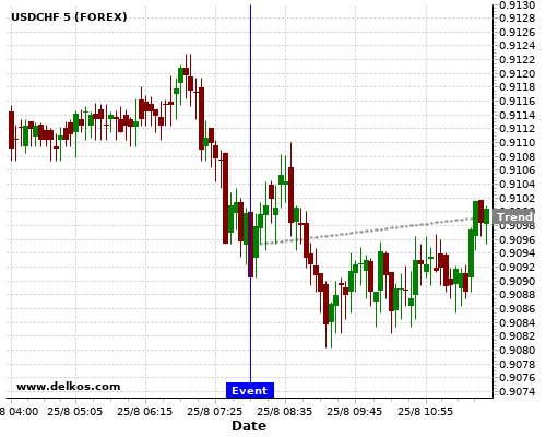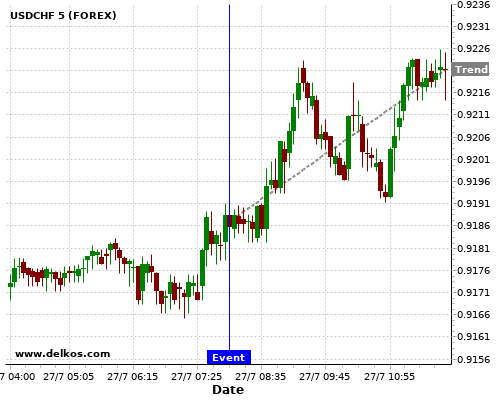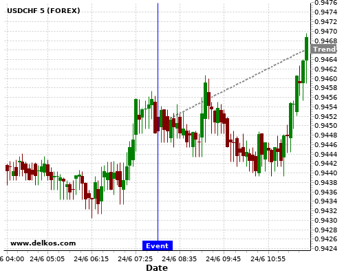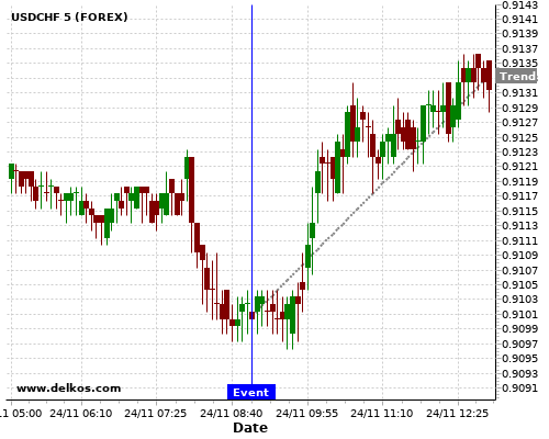 This probability is based on the last 12 DE Ifo Business Climate events, in which 6 of the last 8 events where the actual number was greater than than the economist consensus resulted in an up trend of USDCHF.