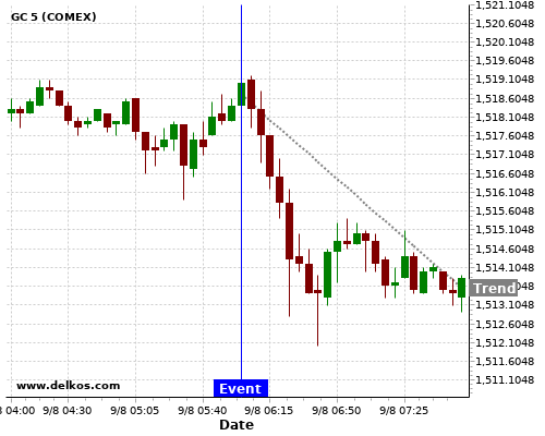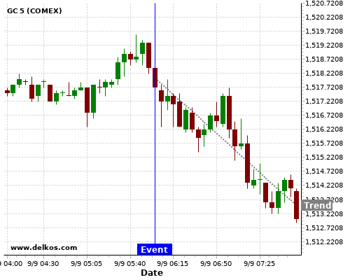 This probability is based on the last 12 DE Balance of Trade events, in which 2 of the last 9 events where the actual number was greater than than the economist consensus resulted in an down trend of GC.