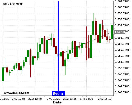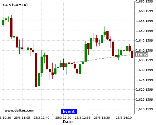 This probability is based on the last 12 US Durable Goods Orders MoM events, in which 5 of the last 9 events where the actual number was greater than than the economist consensus resulted in an up trend of GC.