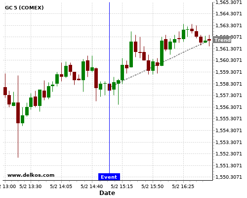 This probability is based on the last 12 US ISM Non-Manufacturing PMI events, in which 4 of the last 9 events where the actual number was greater than than the economist consensus resulted in an up trend of GC.