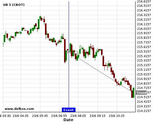 This probability is based on the last 12 DE Markit Manufacturing PMI Flash events, in which 7 of the last 9 events where the actual number was greater than than the economist consensus resulted in an down trend of UB.