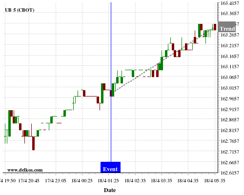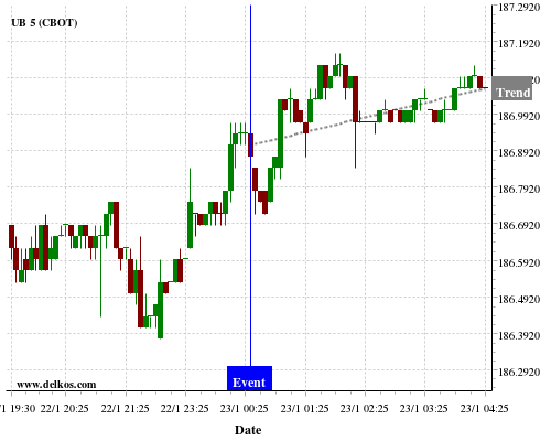 This probability is based on the last 12 AU Employment Change events, in which 7 of the last 9 events where the actual number was greater than than the economist consensus resulted in an up trend of UB.