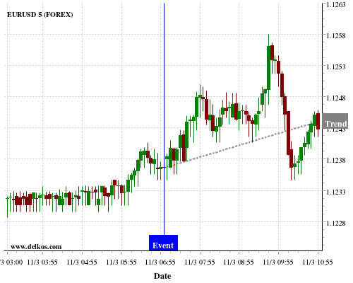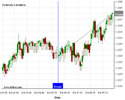 This probability is based on the last 12 DE Balance of Trade events, in which 8 of the last 10 events where the actual number was greater than than the economist consensus resulted in an up trend of EURUSD.