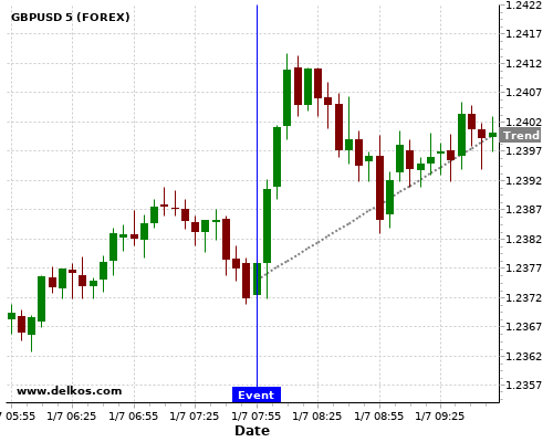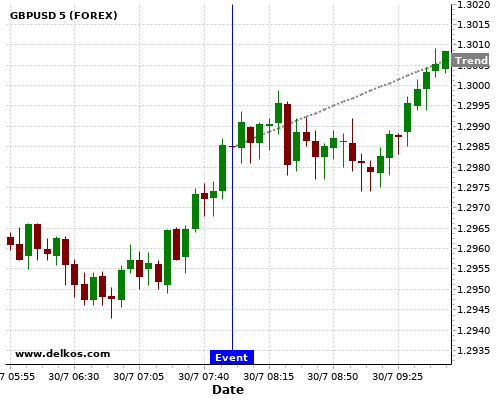 This probability is based on the last 12 DE Unemployment Rate events, in which 4 of the last 5 events where the actual number was less than than the economist consensus resulted in an up trend of GBPUSD.