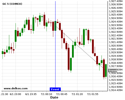 This probability is based on the last 12 AU Balance of Trade events, in which 4 of the last 5 events where the actual number was less than than the economist consensus resulted in an down trend of GC.