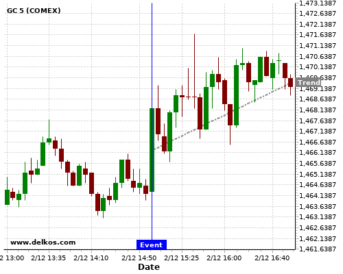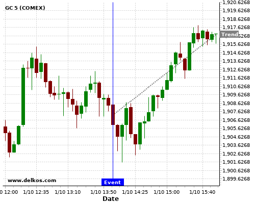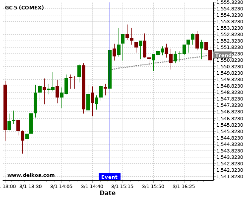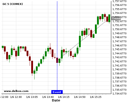 This probability is based on the last 12 US ISM Manufacturing PMI events, in which 4 of the last 5 events where the actual number was less than than the economist consensus resulted in an up trend of GC.