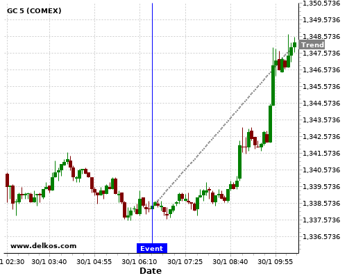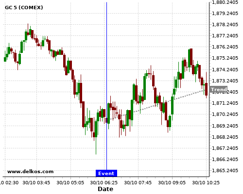 This probability is based on the last 12 FR GDP Growth Rate QoQ Prel events, in which 4 of the last 5 events where the actual number was greater than than the economist consensus resulted in an up trend of GC.