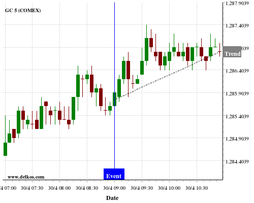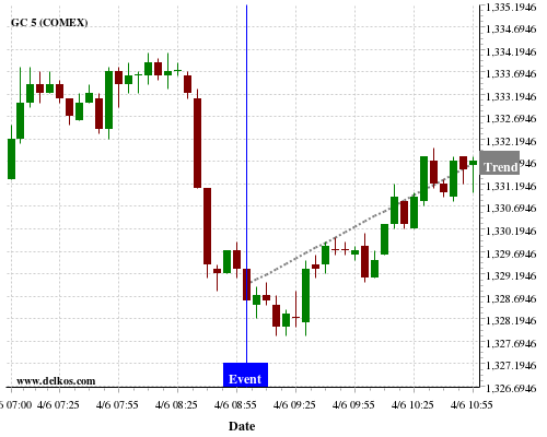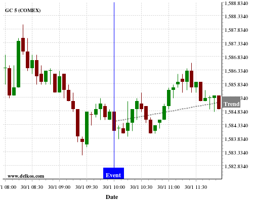 This probability is based on the last 12 EMU Unemployment Rate events, in which 4 of the last 5 events where the actual number was less than than the economist consensus resulted in an up trend of GC.