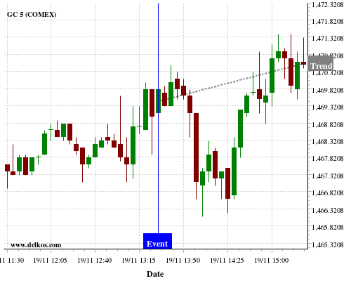 This probability is based on the last 12 US Housing Starts events, in which 3 of the last 5 events where the actual number was less than than the economist consensus resulted in an up trend of GC.