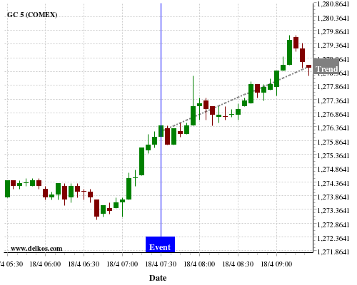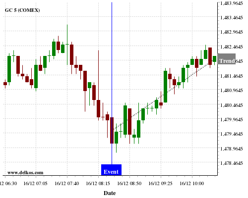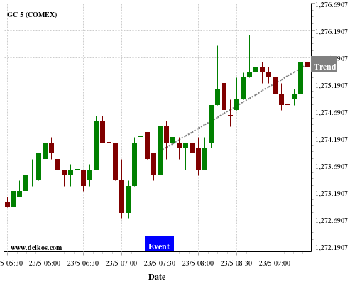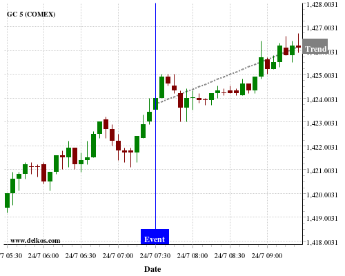 This probability is based on the last 12 DE Markit Manufacturing PMI Flash events, in which 4 of the last 5 events where the actual number was less than than the economist consensus resulted in an up trend of GC.