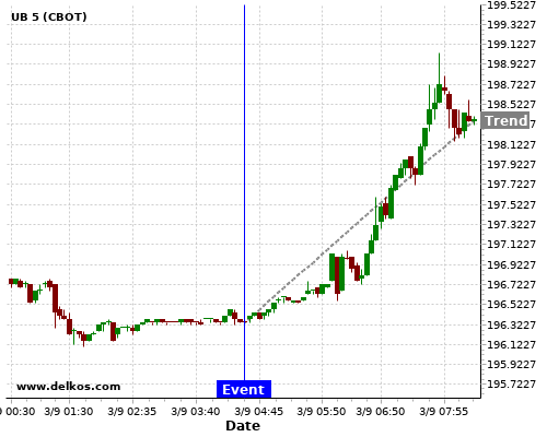 This probability is based on the last 12 AU RBA Interest Rate Decision events, in which 4 of the last 11 events where the actual number was equal to than the economist consensus resulted in an up trend of UB.