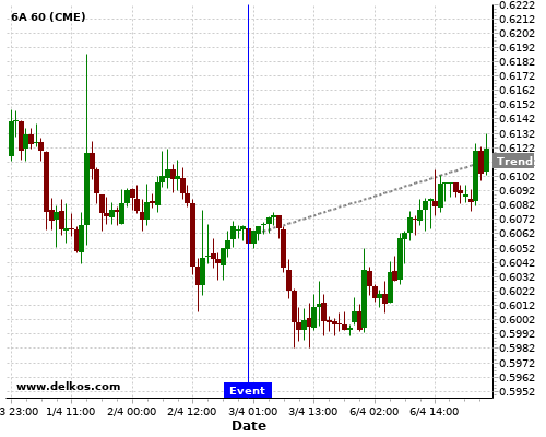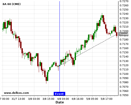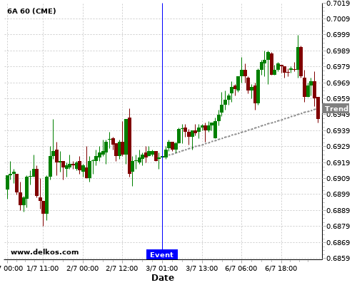 This probability is based on the last 12 AU Retail Sales MoM events, in which 5 of the last 6 events where the actual number was greater than than the economist consensus resulted in an up trend of 6A.
