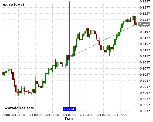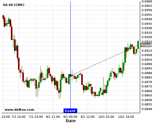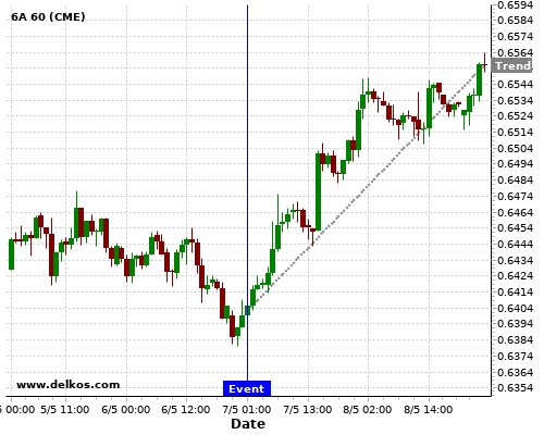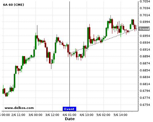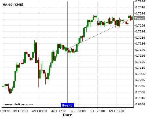 This probability is based on the last 12 AU Balance of Trade events, in which 5 of the last 6 events where the actual number was greater than than the economist consensus resulted in an up trend of 6A.