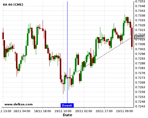 This probability is based on the last 12 US Philadelphia Fed Manufacturing Index events, in which 5 of the last 6 events where the actual number was greater than than the economist consensus resulted in an up trend of 6A.