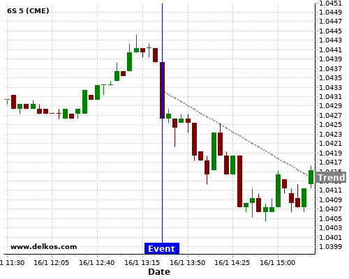 This probability is based on the last 12 US Philadelphia Fed Manufacturing Index events, in which 5 of the last 6 events where the actual number was greater than than the economist consensus resulted in an down trend of 6S.