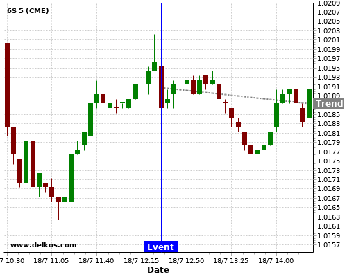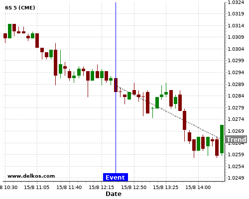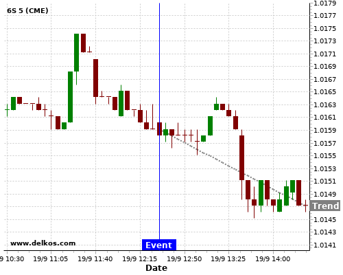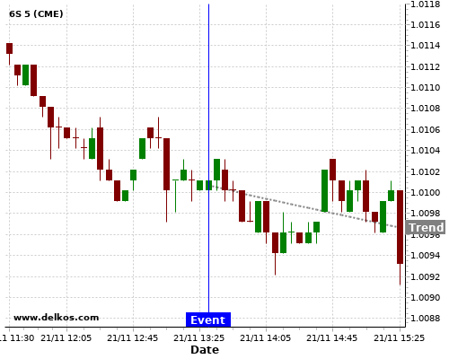 This probability is based on the last 12 US Philadelphia Fed Manufacturing Index events, in which 5 of the last 6 events where the actual number was greater than than the economist consensus resulted in an down trend of 6S.