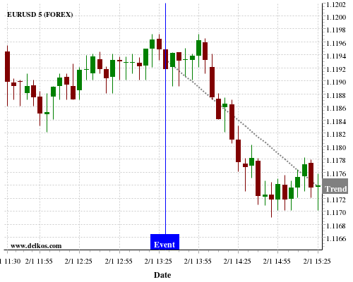 This probability is based on the last 12 US Continuing Jobless Claims events, in which 5 of the last 6 events where the actual number was greater than than the economist consensus resulted in an down trend of EURUSD.