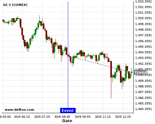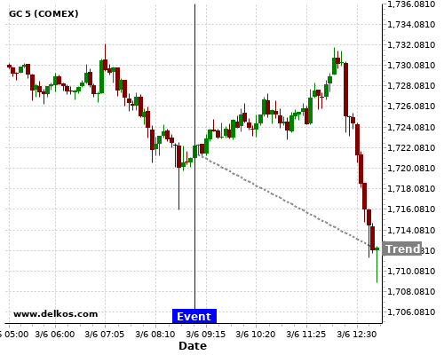 This probability is based on the last 12 EMU Unemployment Rate events, in which 5 of the last 6 events where the actual number was less than than the economist consensus resulted in an down trend of GC.