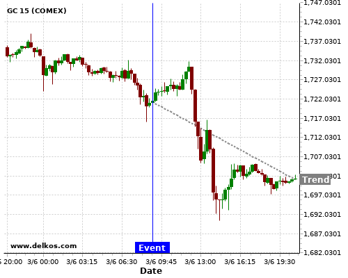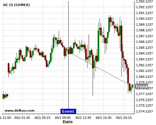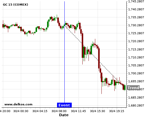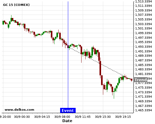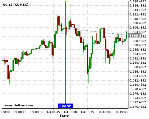 This probability is based on the last 12 EMU Unemployment Rate events, in which 5 of the last 6 events where the actual number was less than than the economist consensus resulted in an down trend of GC.
