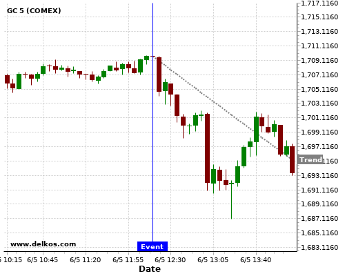 This probability is based on the last 12 US ADP Employment Change events, in which 5 of the last 6 events where the actual number was less than than the economist consensus resulted in an down trend of GC.