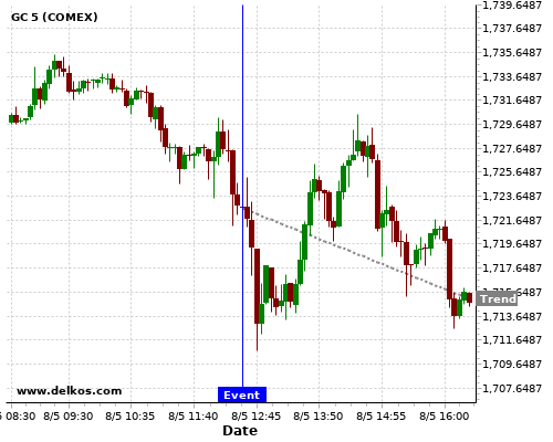 This probability is based on the last 12 US Non Farm Payrolls events, in which 5 of the last 6 events where the actual number was greater than than the economist consensus resulted in an down trend of GC.