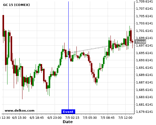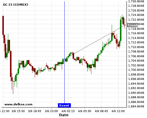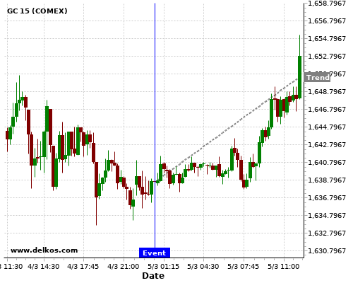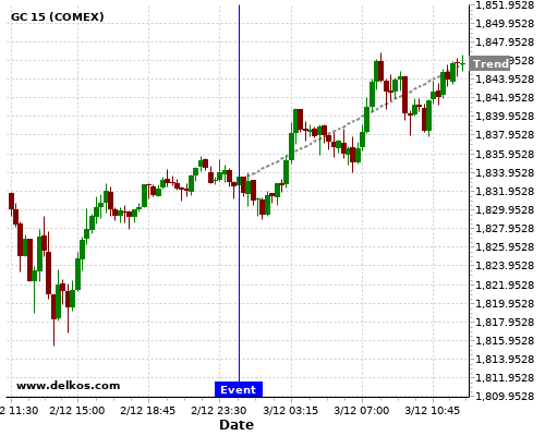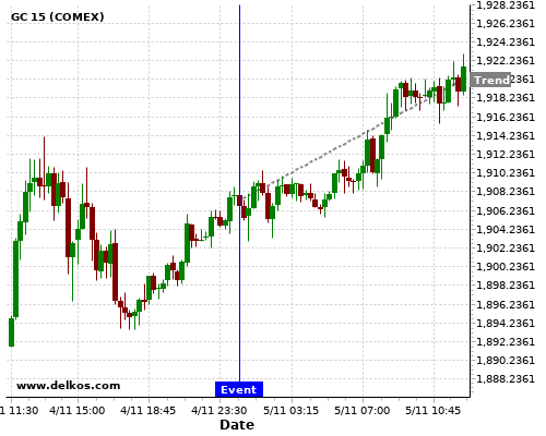 This probability is based on the last 12 AU Balance of Trade events, in which 5 of the last 6 events where the actual number was greater than than the economist consensus resulted in an up trend of GC.