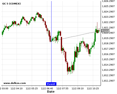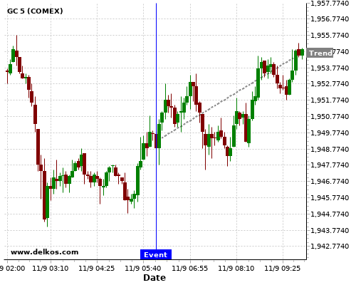 This probability is based on the last 12 GB Balance of Trade events, in which 5 of the last 6 events where the actual number was less than than the economist consensus resulted in an up trend of GC.