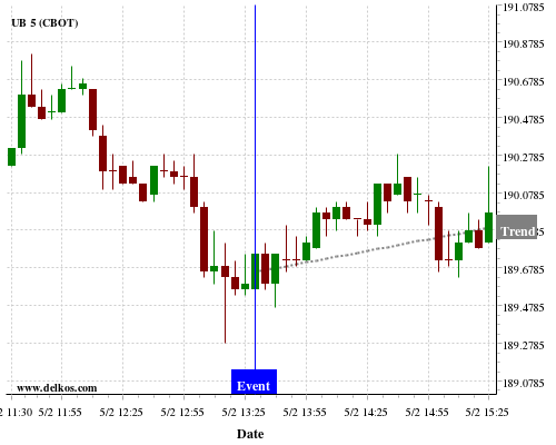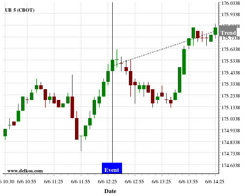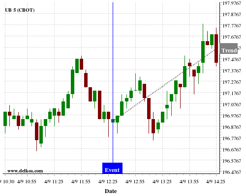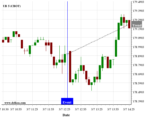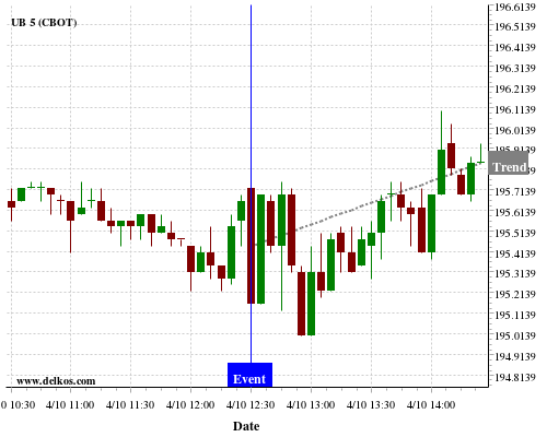 This probability is based on the last 12 US Balance of Trade events, in which 5 of the last 6 events where the actual number was less than than the economist consensus resulted in an up trend of UB.
