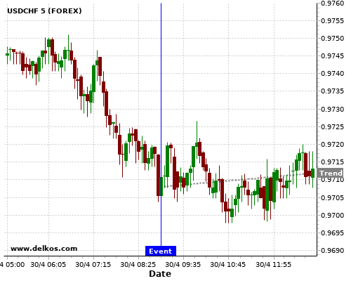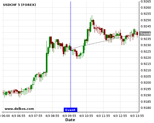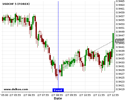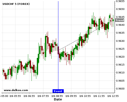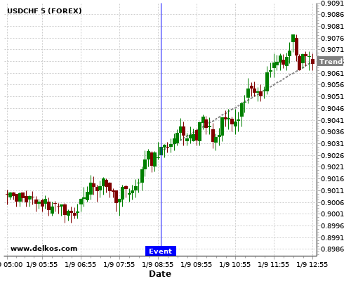 This probability is based on the last 12 EMU Unemployment Rate events, in which 5 of the last 6 events where the actual number was less than than the economist consensus resulted in an up trend of USDCHF.