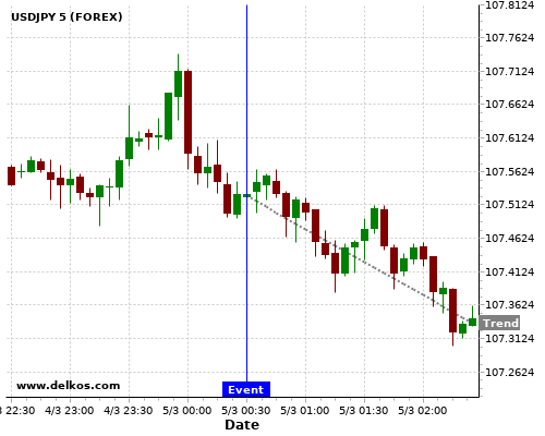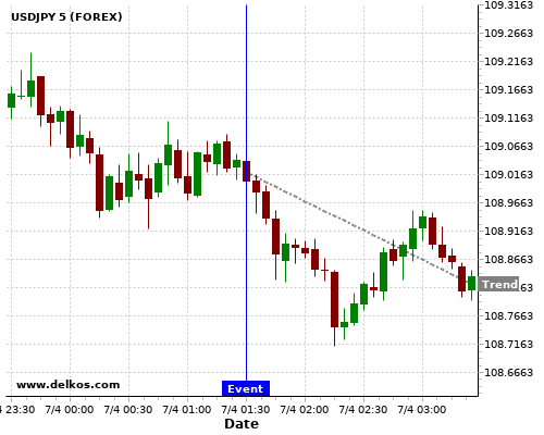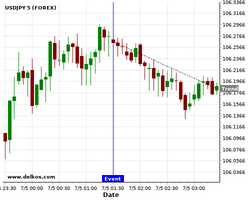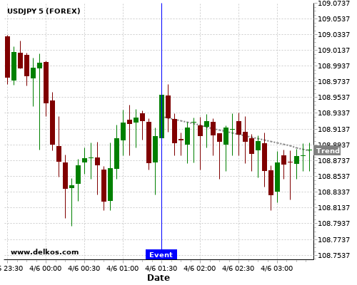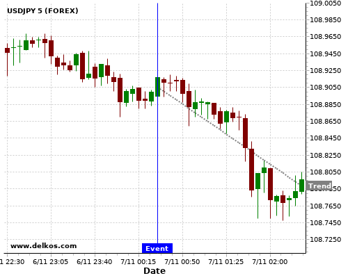 This probability is based on the last 12 AU Balance of Trade events, in which 5 of the last 6 events where the actual number was greater than than the economist consensus resulted in an down trend of USDJPY.