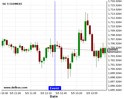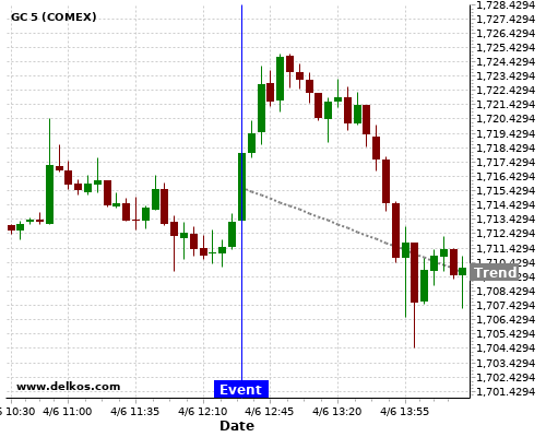 This probability is based on the last 12 US Balance of Trade events, in which 3 of the last 7 events where the actual number was less than than the economist consensus resulted in an down trend of GC.
