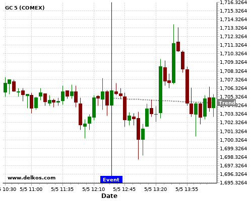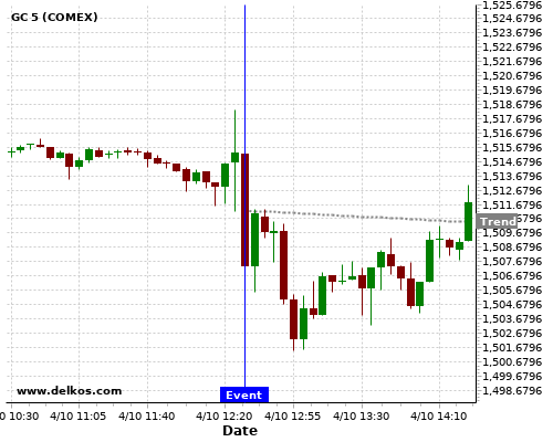 This probability is based on the last 12 US Balance of Trade events, in which 3 of the last 7 events where the actual number was less than than the economist consensus resulted in an down trend of GC.
