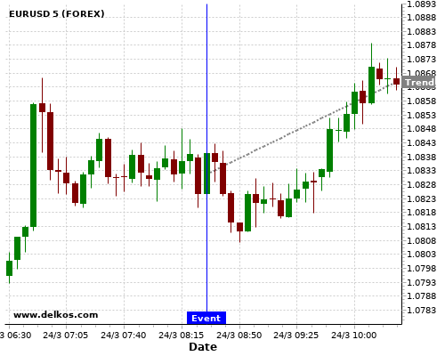 This probability is based on the last 12 DE Markit Manufacturing PMI Flash events, in which 1 of the last 7 events where the actual number was greater than than the economist consensus resulted in an up trend of EURUSD.