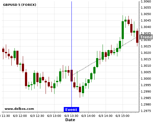 This probability is based on the last 12 CA Employment Change events, in which 5 of the last 7 events where the actual number was greater than than the economist consensus resulted in an up trend of GBPUSD.