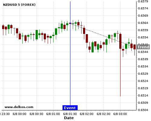This probability is based on the last 12 AU Balance of Trade events, in which 4 of the last 7 events where the actual number was greater than than the economist consensus resulted in an down trend of NZDUSD.
