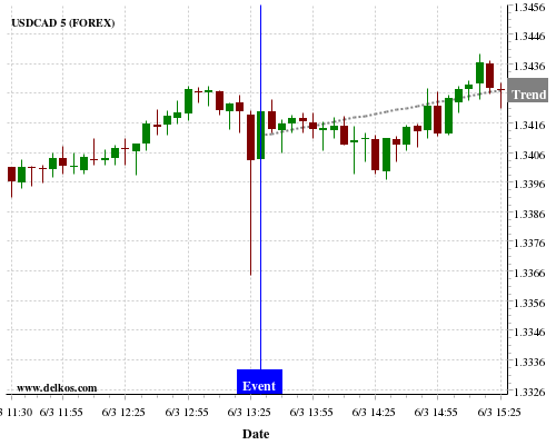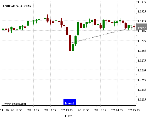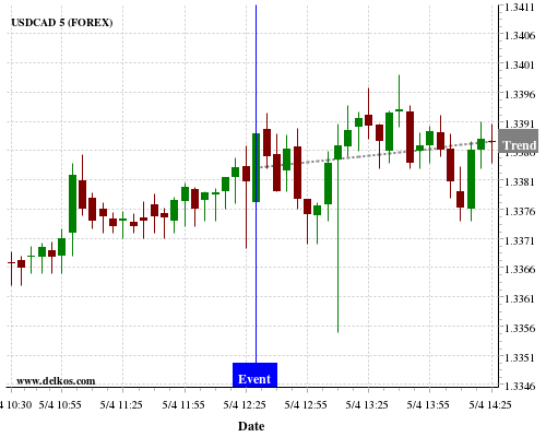 This probability is based on the last 12 US Non Farm Payrolls events, in which 5 of the last 7 events where the actual number was greater than than the economist consensus resulted in an up trend of USDCAD.