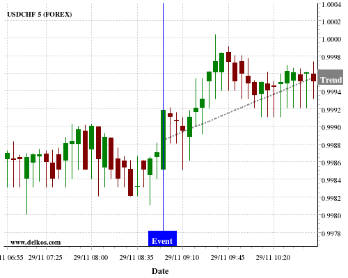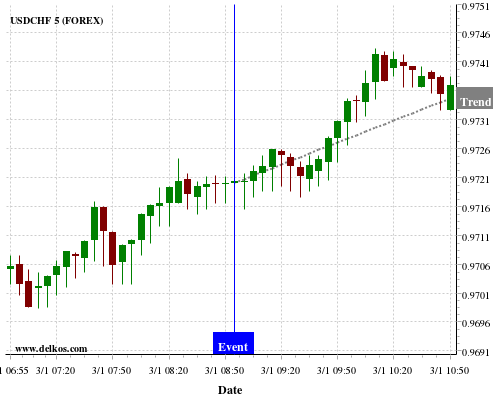 This probability is based on the last 12 DE Unemployment Rate events, in which 8 of the last 11 events where the actual number was equal to than the economist consensus resulted in an up trend of USDCHF.