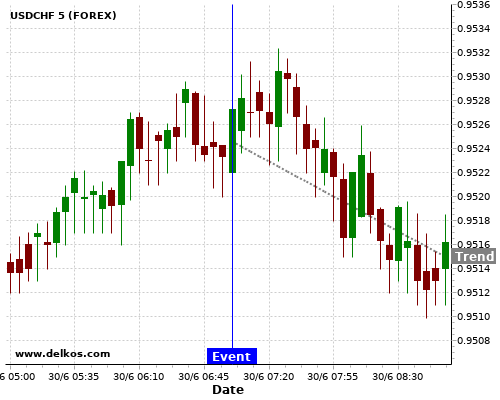 If the number is less than than economists’ consensus there is a 75% probability that USDCHF will trend down following the news event.