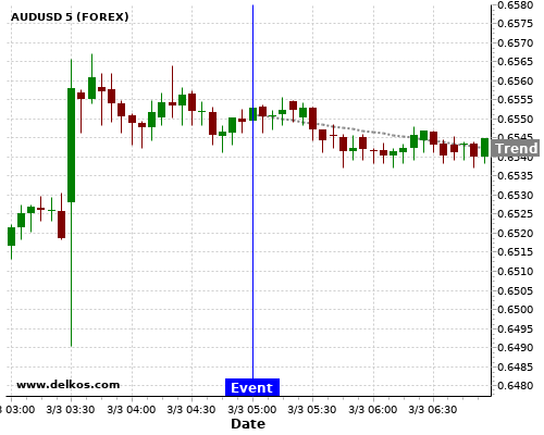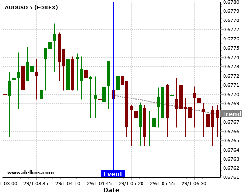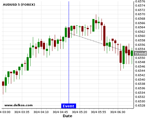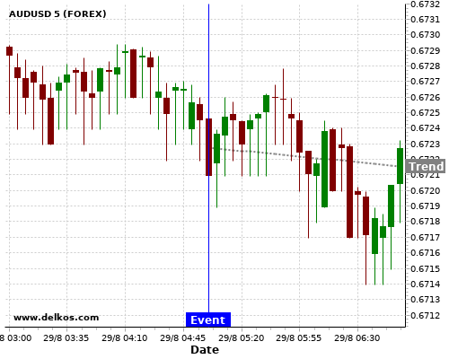 If the number is less than than economists’ consensus there is a 77.77% probability that AUDUSD will trend down following the news event.