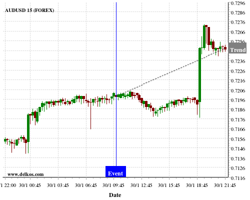 This probability is based on the last 12 EMU Business Confidence events, in which 7 of the last 9 events where the actual number was less than than the economist consensus resulted in an up trend of AUDUSD.